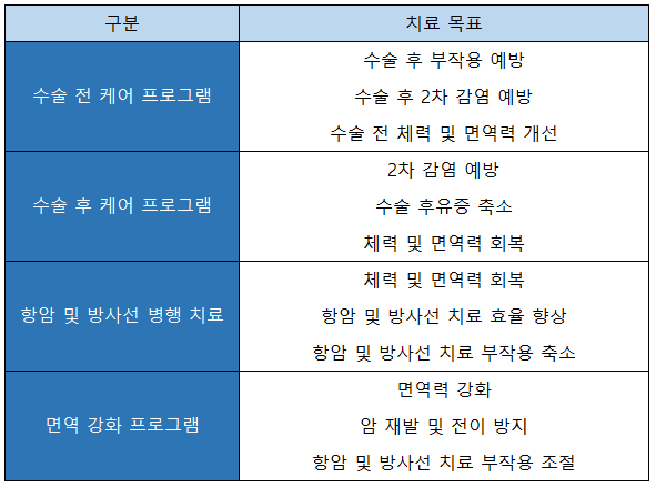 암 치료 과정에 환우분들에게 종합적인 지원과 보조 치료로 제공하는 프로그램이라고 할 수 있습니다.