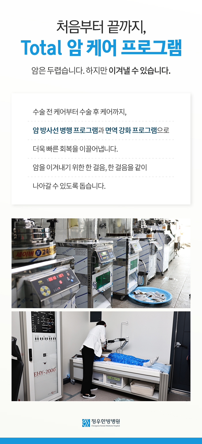 이어지는 글은 암 환우분들이 치료 전후로 받을 청우한방병원 암 케어 프로그램에 대해서