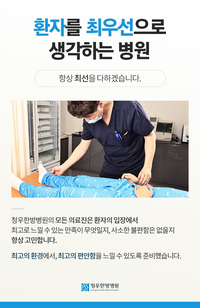 청우한방병원의 모든 의료진은 환우분들을 가족과 같이 따뜻한 마음으로 응원을 하며